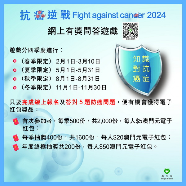 衛生局舉辦的「抗癌逆戰Fight against cancer」網上有奬問答遊戲於2月1日起開始分四季進行,目的是宣傳預防癌症,透過問答遊戲的形式以提高居民的癌症防治核心知識,居民可透過活動網址(app.ssm.gov.mo/fightagainstcancer2024)即時參與遊戲,並有機會抽到電子紅包。