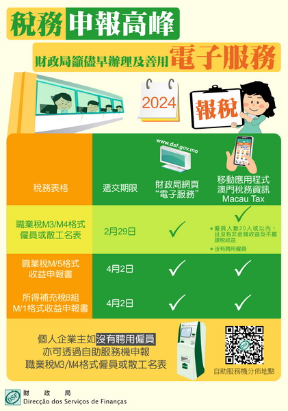 居民除可於辦公時間星期一至五上午九時至下午六時親臨財政局南灣財政局總局大樓、黑沙環政府綜合服務大樓和氹仔離島政府綜合服務中心三個辦公地點外,為便利市民及免卻排隊輪候,職業稅M/5格式收益申報書、所得補充稅B組M/1格式收益申報書已可透過財政局網頁之「電子服務」、移動應用程式「澳門稅務資訊Macau Tax」進行申報。