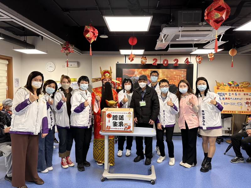澳電愛心大使由明暉負責人帶領參觀中心設施及日常運作後,並在活動室與長者唱歌玩遊戲,以音樂及互動遊戲瞬間破冰;澳電同事裝扮的龍年財神更率領愛心大使走入病房探訪卧床長者,送上手寫揮春祝願大家身體健康、精神爽利。