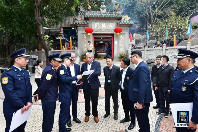 【本報消息】農曆新年將至,本澳將舉辦多項大型賀歲節慶活動,預計將吸引大量旅客訪澳,為保障新春前後本澳的公共秩序與安全,確保市民及旅客歡度佳節,警察總局局長助理梁文照聯同澳門海關代助理關長葉華釗、旅遊局副局長許耀明、治安警察局副局長梁慶康、司法警察局副局長蘇兆強、消防局代副局長林俊生以及交通事務局、市政署和文化局等多名領導及主管人員,前往媽閣廟、花車巡遊沿線、塔石廣場年宵攤位等地進行實地巡視,聽取各警務單位及相關部門在新春期間的工作部署,包括警務、交通、人流管制及緊急救援措施等,亦了解新年煙花表演期間的工作安排。