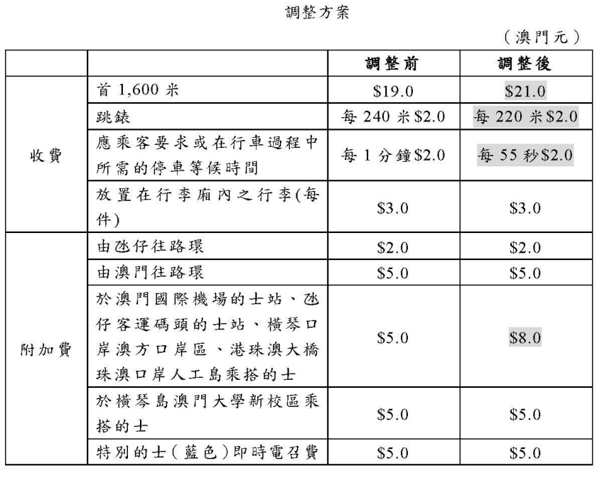 【本報消息】行政長官批示調整本澳的士服務收費並由2月8日起實施,整體加幅約一成,起錶首1,600米由現時的19澳門元加至 21元,之後每跳由 240米縮短至 220米,每跳維持兩元;停車等候期間亦由每分鐘跳錶縮短至每 55秒,當中亦包括在機場的士站、氹仔客運碼頭的士站、橫琴口岸澳方口岸區或港珠澳大橋珠澳口岸人工島乘車附加費,從現時五元加至八元。從澳門大學橫琴校區乘搭的士附加費,澳門及氹仔往路環附加費以及行李附加費均維持不變。