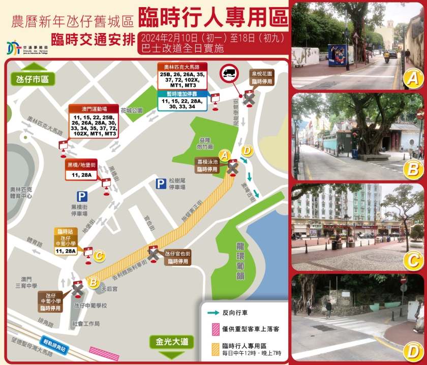 巴士方面,途經行人專用區範圍之多條巴士路線由2月10日首班車至18日尾班車期間實施全日改道,泉悅花園站、嘉模泳池站、氹仔官也街站和氹仔中葡小學站臨時停用,乘客可至奧林匹克大馬路站及澳門運動場站上落,另於巴波沙總督前地、鄰近氹仔中葡小學位置設臨時站,供11及28A路線停靠,詳情可瀏覽兩巴網站。