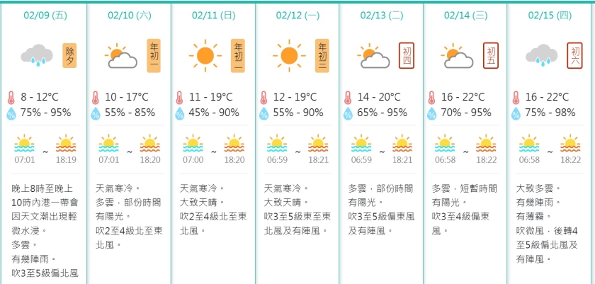 當局預料本澳農曆新年假期會轉受乾燥冬季季風影響,早晚天氣寒冷,但天色會好轉;根據氣象局七日天氣預報,年初一至年初三本澳天氣仍然寒冷,其中年初一仍然有雲,但天色逐漸好轉並再次見到陽光,年初二至三會維持有陽光的晴朗天氣,氣溫介乎10度至19度,日夜溫差較大,日間外出拜年的居民仍然要帶備防風保暖的外套,以防晚間降溫寒冷。