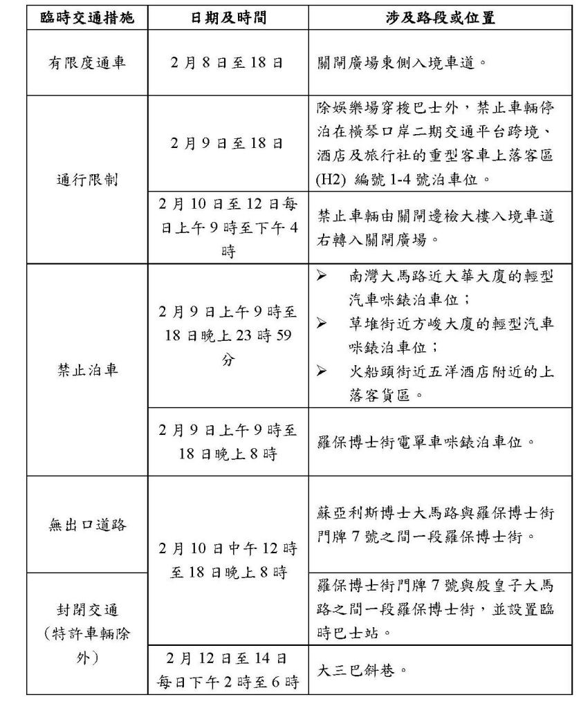 其中巴士方面,兩間巴士公司將因應假日增加服務班次及增開部份路線特班車,以應對乘客需求;八條日間巴士路線於2月9日(年卅晚)延長服務時間至翌日凌晨一時;於2月10日(年初一)至18日(年初九)期間,關閘廣場東側及南灣一帶的公交服務會實施臨時安排,並封閉羅保博士街往殷皇子大馬路方向路口,設置排隊設施供乘客候車。