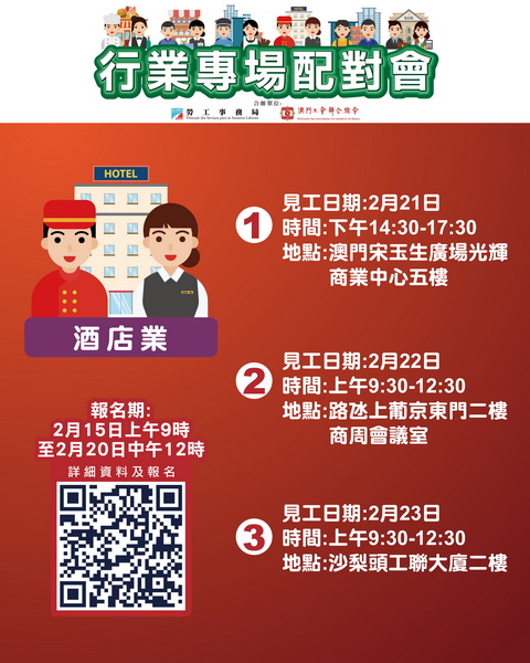 2月21日下午舉辦酒店業配對會,提供18個職位空缺,涉及保安員、給排水系統主任、特殊效果主任、影音系統高級技術員、樓宇維護高級技術員及電氣技術員等。配對會在澳門宋玉生廣場光輝商業中心五樓舉行。