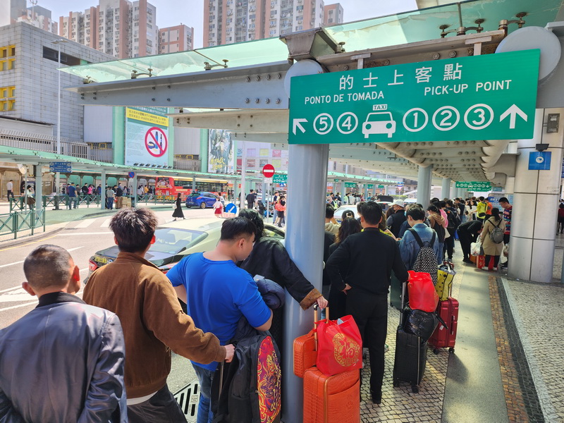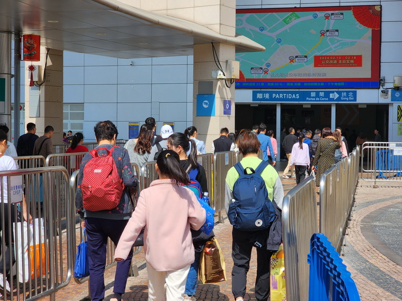 大批旅客壓境之下,本澳多個口岸都人頭湧湧,其中最多旅客使用的關閘口岸,多家酒店的穿梭巴士都大排長龍,有前往澳門中區的酒店職員提示旅客穿梭巴士排隊時間需時約60分鐘,但仍然有大批旅客繼續排隊;的士站亦排起兩道長長的人龍,有排在前列位置的旅客表示已排隊至少半小時。