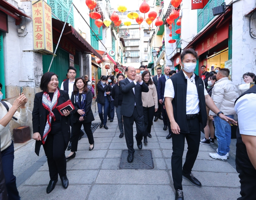 【本報消息】行政長官賀一誠伉儷於大年初四先後到大炮台花園、媽閣塘片區、益隆炮竹廠舊址、荔枝碗船廠片區、福隆新街步行區及新馬路片區,瞭解各片區新春期間活動舉辦情況,感受片區新春熱鬧氛圍,並與現場的居民和旅客親切交流。多個片區在新春期間人氣鼎盛,吸引本澳市民旅客到訪,發揮引流效果,引領到訪者感受本澳創新的文化旅遊體驗。