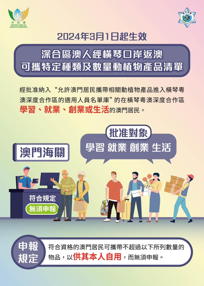 為配合深合區「一線放開,二線管住」分線管理模式更好地落實,自三月一日起,在深合區學習、就業、創業或生活,且已納入「允許澳門居民攜帶相關動植物產品進入橫琴粵澳深度合作區的適用人員名單庫」的澳門居民,可經橫琴口岸攜帶供個人自用,且每人每日一次可攜帶貨物總重量不超過五公斤的特定種類及數量的動植物產品返回澳門,無需申請進口准照或作出相關申報。