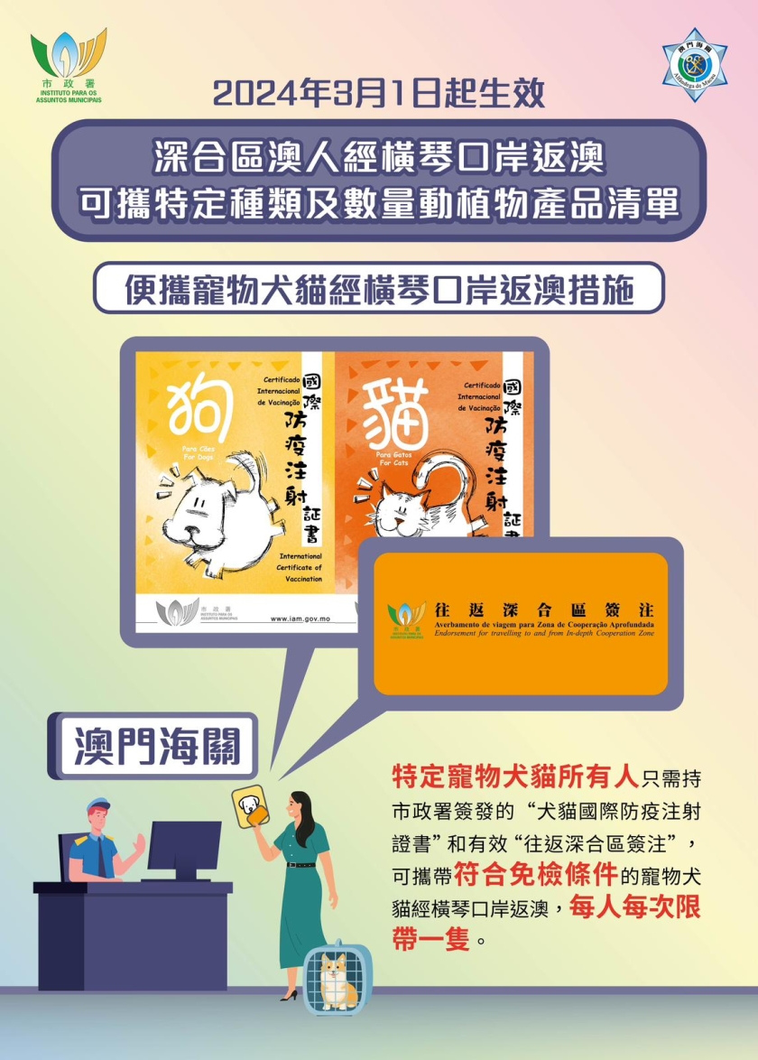 與此同時,已被納入該適用人員名單庫的寵物犬貓所有人,若名下的犬貓已在市政署植入電子晶片,經向市政署申請及獲確認符合免檢條件後,可憑市政署簽發的「犬貓國際防疫注射證書」和「往返深合區簽注」,在簽注有效期內持有關文件多次攜同符合免檢條件的寵物犬貓經橫琴口岸返澳,每名飼主每次限帶一隻,即可免卻過往每次返澳前辦理進口申報、檢疫及申辦動物健康證明書等程序。