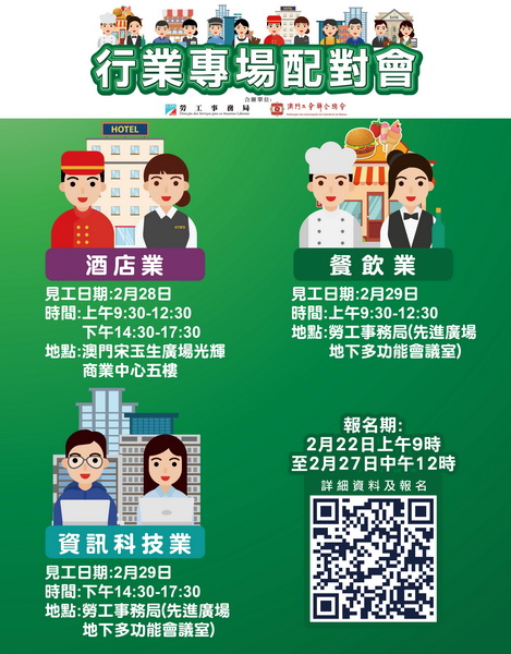 2月28日全日舉辦酒店業配對會,提供156個職位空缺,涉及餐廳助理經理(中餐/西餐/娛樂場)、環境衛生主任、餐飲部長(中餐)、管家部協調員、前台服務員、廚師領班、調酒員、制服服務員、廚師及餐飲服務員等。配對會在澳門宋玉生廣場光輝商業中心五樓舉行。