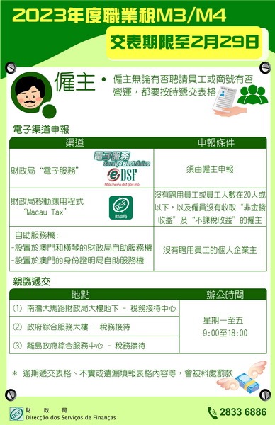 倘僱主選擇遞交M3/M4紙本表格,可於辦公時間內親臨財政局各個服務地點遞交。
