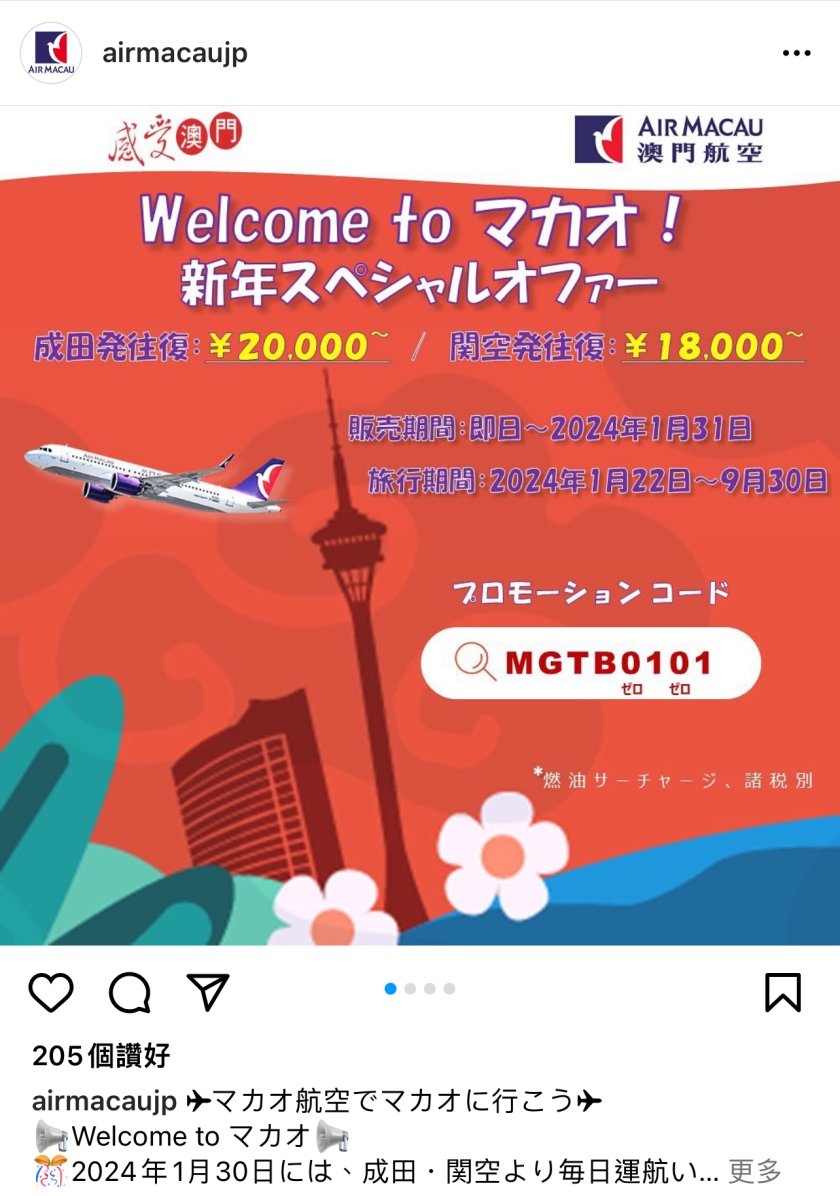 國際航線方面,旅遊局與各航空公司合作,向國際旅客陸續推出不同的優惠方案,以直航或轉乘方式來澳門旅遊。其中與澳門航空推出不同組合的機票優惠,包括國際航線至澳門機票直減或買一送一優惠、一程多站機票直減,享受以上優惠的旅客需要符合相關的留澳天數。此外,旅遊局將與其他國際航空公司合作,向由馬來西亞、新加坡、菲律賓、泰國、韓國及北美洲航點啟程的國際旅客招手,提供不同形式的優惠,例如推出限時機票促銷+多樣旅遊產品優惠,又會透過與國際航空公司合作的旅行社推銷澳門旅遊目的地套票優惠等。