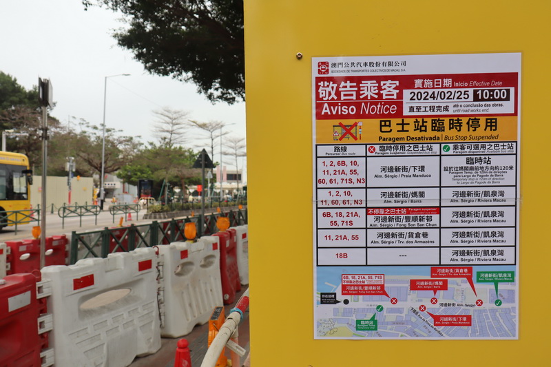 這一輪交通措施不單影響駕駛者,是次改道同時影響附近多個巴士站點,其中近聖瑪沙利羅學校的「河邊新街/下環」巴士站周日上午10時起暫停使用,乘客需要改往媽閣方向步行約120米,即新福花園對出位置乘搭巴士;與此同時,同樣受該工程影響去年二月起停用的「河邊新街/凱泉灣」巴士站恢復運作,除原有路線回復停靠該站外,因應「河邊新街/媽閣」巴士站亦暫停使用,所有相關路線也改為停靠凱泉灣巴士站。