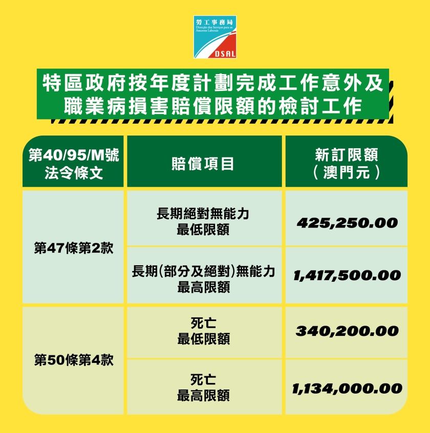 新訂限額如下:第40/95/M號法令條文中第47條第2款中「長期絕對無能力最低限額」和「長期(部分及絕對)無能力最高限額」的新訂限額分別為澳門元425,250和澳門元1,417,500;第50條第4款中「死亡最低限額」和「死亡最高限額」的新訂限額分別是澳門元340,200和澳門元1,134,000。