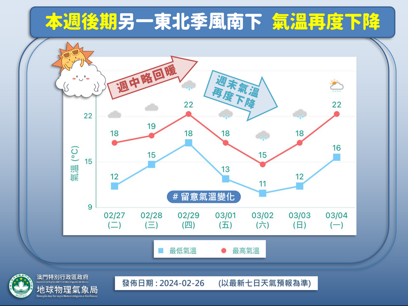 雖然周中氣溫會回升,但氣象局預料本周後期本澳又隨即受到另一股東北季風影響,屆時氣溫會再次明顯下降,多雲有雨;周五初時會有薄霧,多雲及有幾陣雨,吹微風,隨後會轉吹四至五級偏北風及有陣風,氣溫將顯著下降,氣溫會由18度下降至最低的13度。
