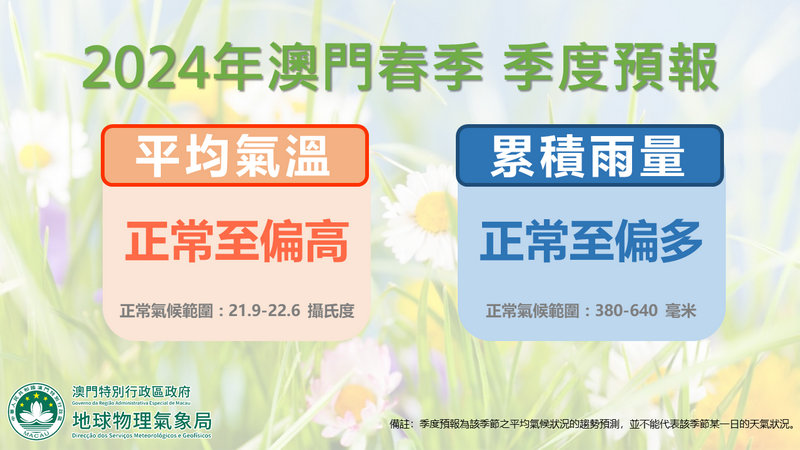 另外,氣象局綜合最新預報資料預測今年本澳春季(三月至五月)的平均氣溫將屬於正常至偏高;而降雨方面,預測整季累積雨量將屬於正常至偏多。