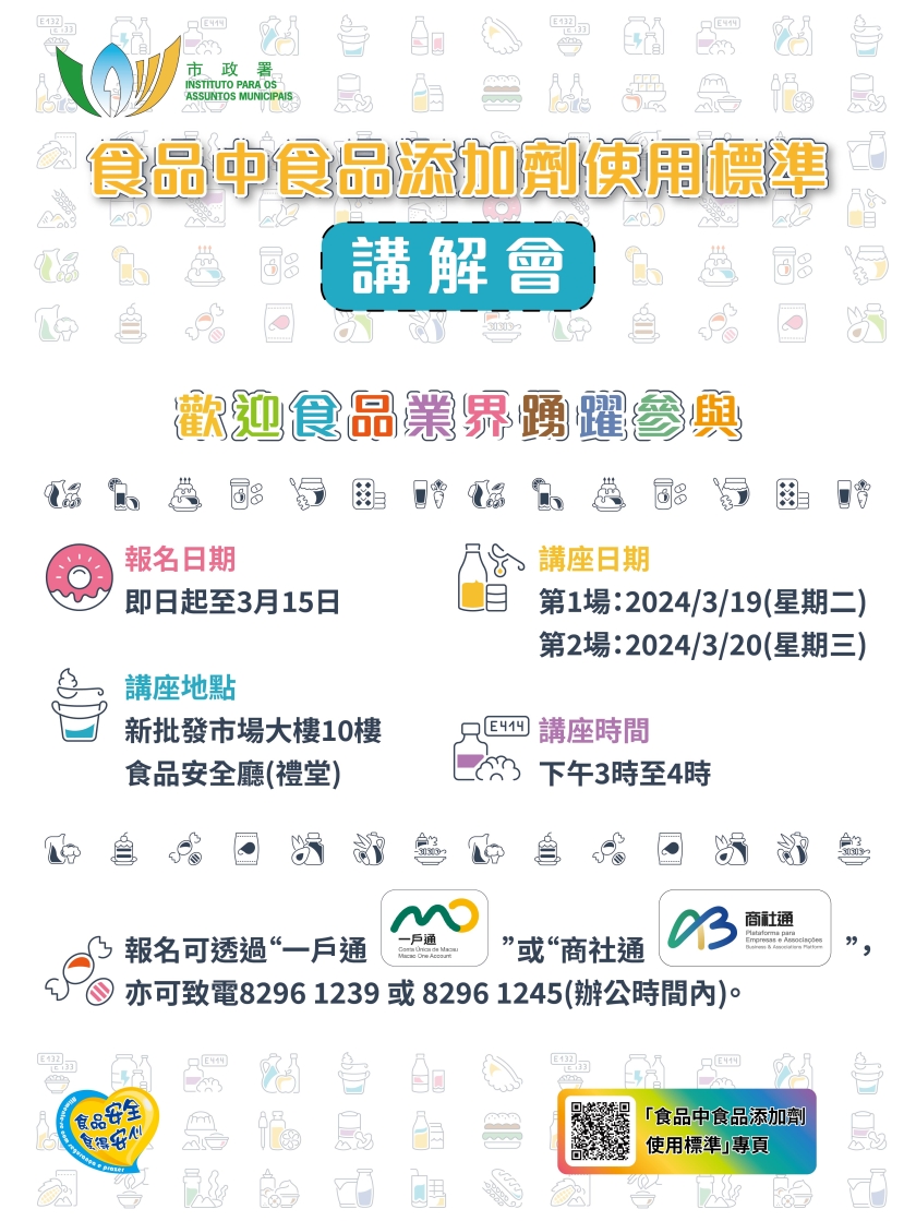 講解會將於澳門新批發市場十樓市政署食品安全廳禮堂舉辦,第一場為19日(星期二)下午三時至四時;第二場為20日(星期三)下午三時至四時。屆時市政署將介紹本澳執行食品添加劑標準的現況,結合法律規範、科學數據及行業實務應用,講解常用的食品添加劑種類及在新法規下的使用規限等。