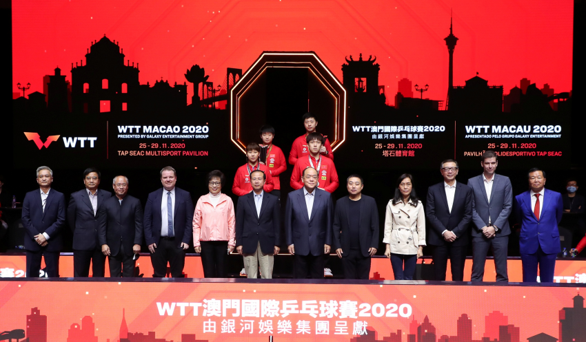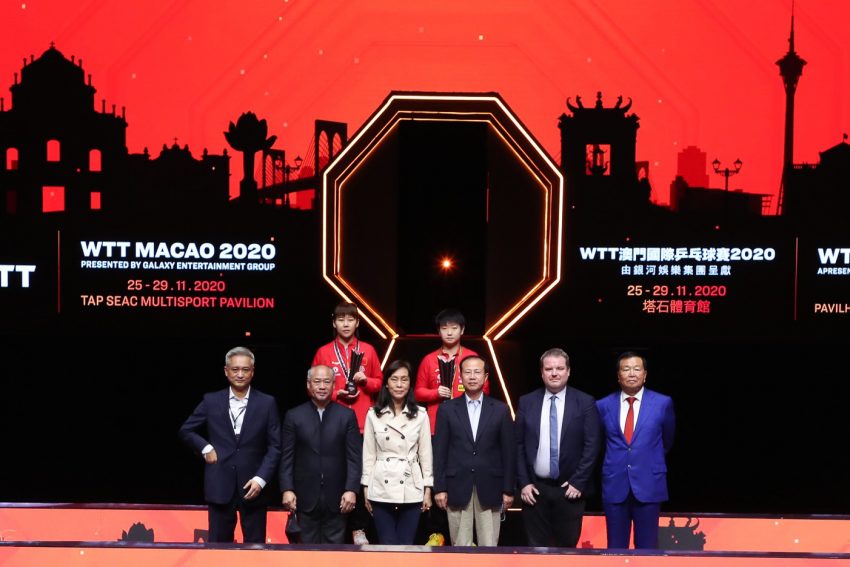 【本報消息】由體育局及世界乒乓球職業大聯盟(WTT)主辦、澳門乒乓總會協辦的「WTT 澳門國際乒乓球賽2020—由銀河娛樂集團呈獻」周日晚上在塔石體育館決出男女子冠軍,馬龍孫穎莎均以局數五比一擊敗王楚欽及陳幸同。賽後由行政長官賀一誠等嘉賓頒發獎項。