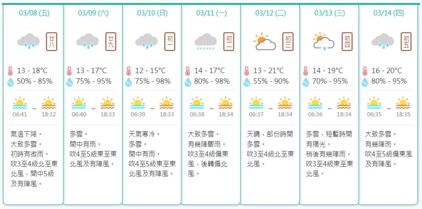 周六多雲及間中有雨,氣溫介乎13度至17度,吹四至五東至東北風及有陣風,相對濕度介乎百分之75至95之間;下周日氣溫進一步下降12度至15度,天氣寒冷,吹四至五東至東北風及有陣風,相對濕度介乎百分之75至98之間。