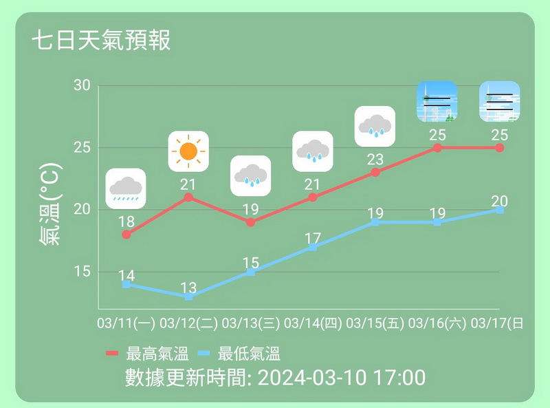 隨著高空擾動遠離本澳,周二本澳天色明顯好轉,大致天晴,吹三至四級北至東北風,氣溫約為13度至21度,相對濕度介乎百分之50至85之間,可惜天色明朗的好天氣只維持約一天,本周中期本澳會轉受偏東氣流影響,東風較大,雲量增多及有幾陣雨,氣溫逐漸回升,周三氣溫約為15度至19度,周四最高氣溫可望回升至21度。