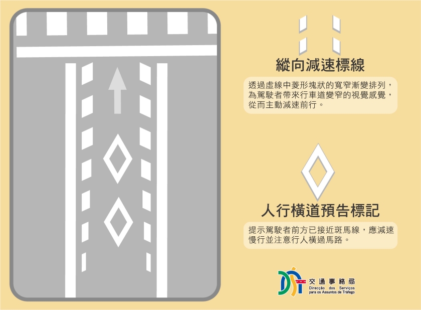 其中,「縱向減速標線」為一組平行於行車道分界線的菱形虛線,常見於坡道、彎道、斑馬線前以及其他需要減速的道路上。透過虛線中菱形塊狀的寬窄漸變排列,為駕駛者帶來行車道變窄的視覺感覺,從而主動控制車速,達至提醒駕駛者減速前行的效果。