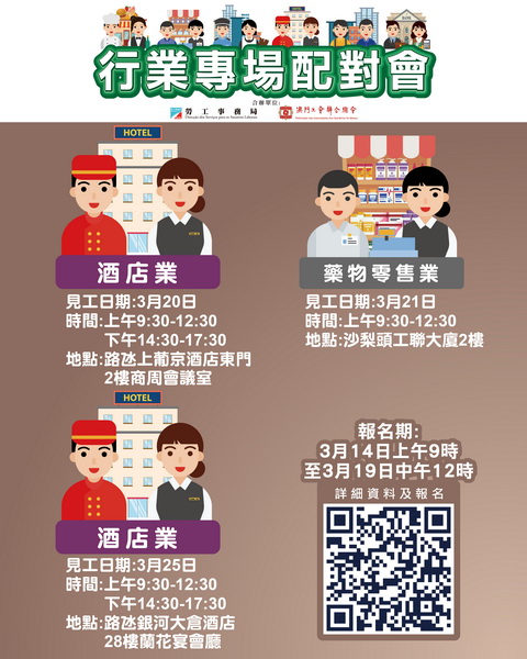 3月21日上午舉辦藥物零售業配對會,提供74個職位空缺,藥劑師及售貨員。配對會在沙梨頭海邊街2-6號工聯大廈工聯二樓舉行。3月25日全日舉辦酒店業配對會,提供25個職位空缺,涉及環境衛生主任、特殊效果主任、特殊效果高級技術員、制服服務員、前台服務員及客戶服務中心服務員等。配對會在澳門大倉酒店28樓舉行。