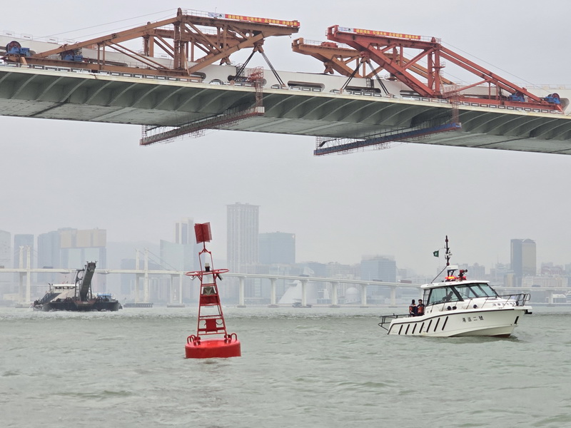 澳門水道是西江出海的重要航道,平均每日有二百多艘不同類型的船舶航經。為配合封航工作,吊裝作業前,珠澳海事部門共同制定交通管制計劃,提前發佈航海通告,引導船舶分流。珠澳雙方分別在周邊的各自水域設置警戒線,通過兩地船舶交通管理中心的遠端管控和公務船現場攔截的方式,對可能闖入警戒區影響作業安全的無關船舶進行了提醒和攔截,保障吊裝作業順利進行。