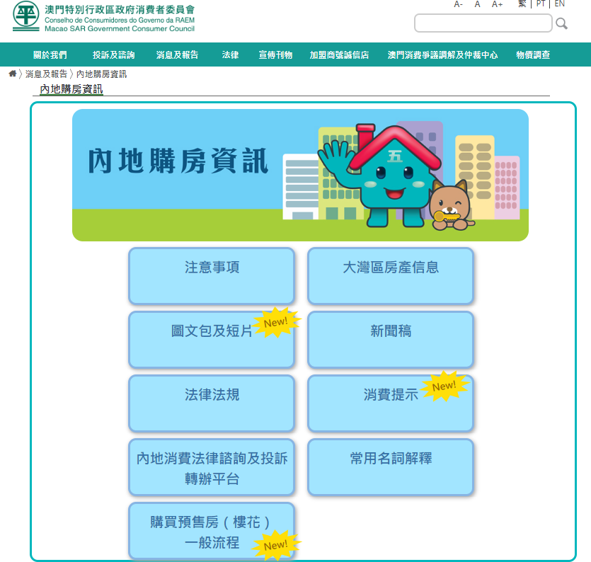 現時越來越多居民計劃在內地購房,有鑑於居民可能不熟悉內地房地產相關法律法規及交易流程,消委會網頁(www.consumer.gov.mo)的「內地購房資訊」專頁新增「購買預售房(樓花)一般流程」專區,扼要說明,並比較內地與澳門的相關流程,包括從準買家查證預售房的預先許可銷售條件、交付定金與簽約的法定程序、繳納稅項,以及業主為購買的預售房辦理房產證等各項流程,讓居民更易及清晰分辨兩地之間的差別,更了解內地購房的相關資訊。