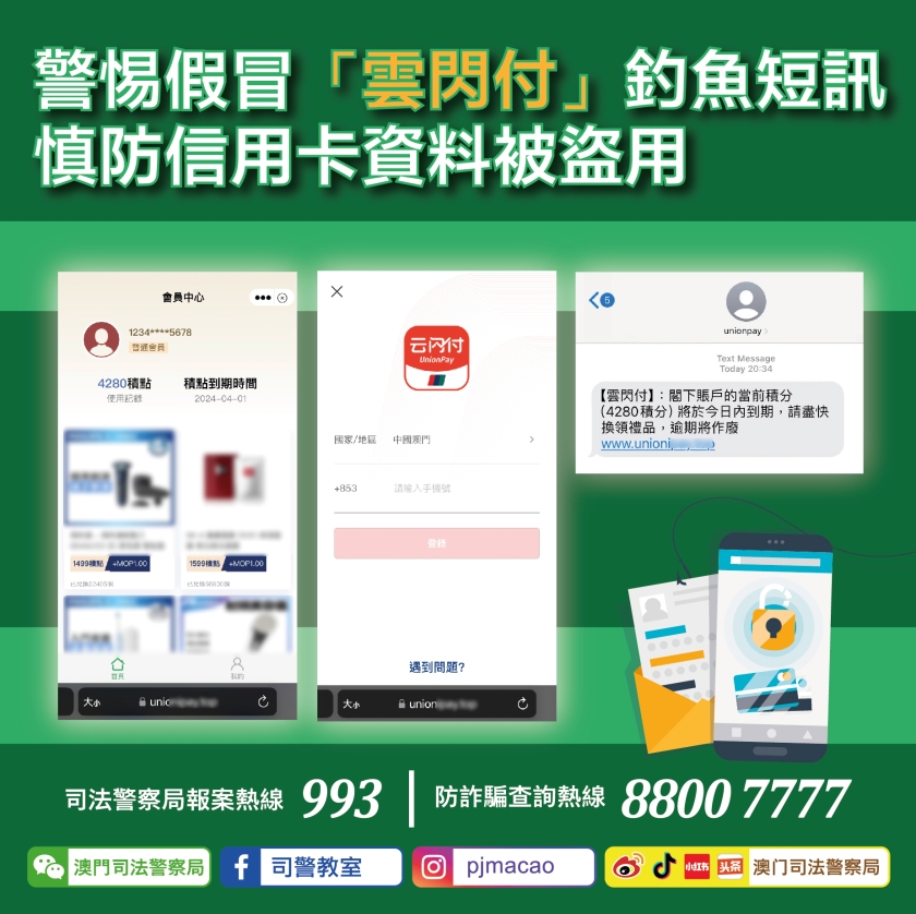 【本報消息】司警局近日先後接獲十多名市民檢舉,報稱收到以電子支付平台「雲閃付」名義發出的短訊,內容以「積分即將到期」為由誘使事主點擊短訊內附帶之連結,繼而進入一個假冒網站並可以低價及積分兌換禮品,藉此套取事主的個人及信用卡資料,事主在輸入一次性驗證碼後,最終導致信用卡被盜用,造成各事主數千至數萬元不等的損失。