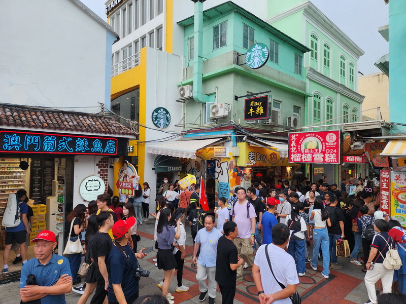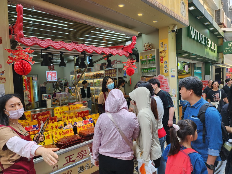 不少港客較喜歡前往的氹仔官也街旅遊區,周一下午人流同樣熱旺,葡撻、牛雜和個別手信店門口繼續排隊,有手信店表示人流較平時周末增多兩成,上升主要是因港客人數增加,不過由於港客經常來澳旅遊,因此每次購買的數量不會多,主要以自用為主,加上經濟環境變化,港客的消費力較過往下跌,消費大多在200元以內,相反部份由較遠省份來澳的內地旅客,會購買較大量的手信作自用和送禮,但消費力明顯也遠不及疫前。