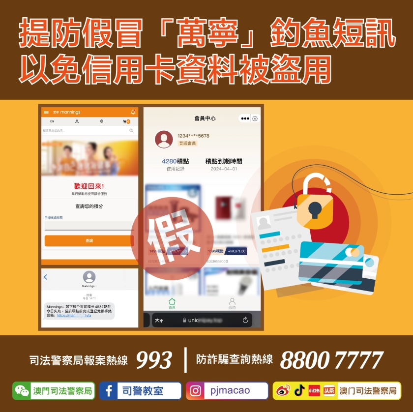 【本報消息】司警局近日發現有騙徒假冒連鎖零售商「萬寧 mannings」向市民發送短訊,訛稱市民積分即將失效,誘騙市民點擊短訊內附帶之連結,繼而進入一個假冒萬寧之網站,並可以積分及低價換購禮品為由誘騙市民輸入信用卡資料,騙徒套取後再進行網上盜用。