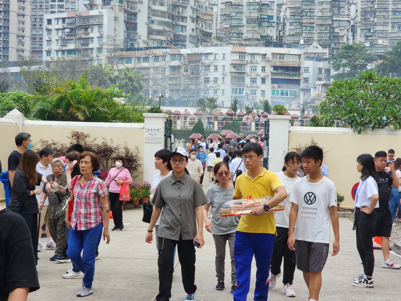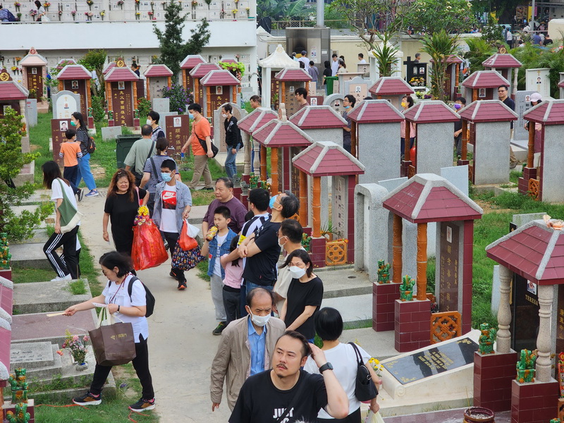 清明節正日早上各大墓園陸續出現扶老攜幼的掃墓人潮,其中望廈新西洋墳場上午人流較多,居民帶同大包小包的紙紥祭品、元寶蠟燭、水果和三牲等,也有居民只帶鮮花緬懷先人;墓園門外有警員指揮交通,墓園內則有工作人員協助居民使用大型化寶爐,早上掃墓人流一直較多,部份主要通道和通道較狹窄的骨灰箱處來往人流較為擠擁,但市民都互相禮讓,場內秩序良好。