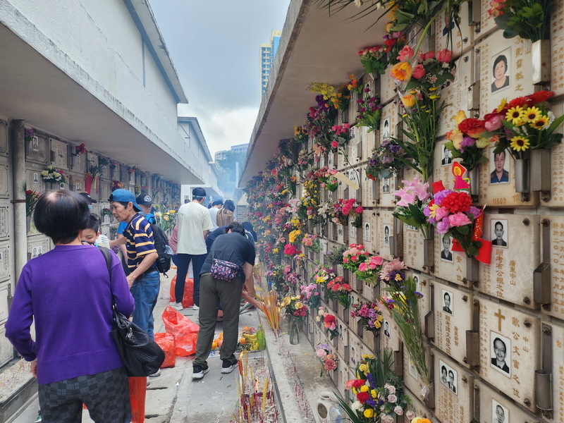 居民拜祭時都有按市政署呼籲使用附近的化寶爐或化寶塔燃燒冥鏹,有居民表示,除非天氣太差和過去疫情時,每年都會選擇在清明節正日掃墓,並會提前準備祭品,今年的祭品價格繼續稍微提升,但仍然在接受範圍內,花費了數百元。也有只帶備鮮花的居民指,掃墓主要是心意,認為鮮花已經足夠,也更環保。
