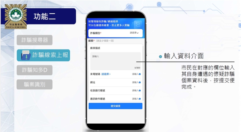 司警指經充分參考不同地區的經驗和做法,同時考慮本澳法律、公眾使用習慣和切合澳門實際情況,經過深入研究及測試,正式在司警局微信公眾號(PJ_Macao)推出反詐程式,冀助公眾提高對詐騙的識別能力,增強防騙意識,進一步減低上當受騙的風險。