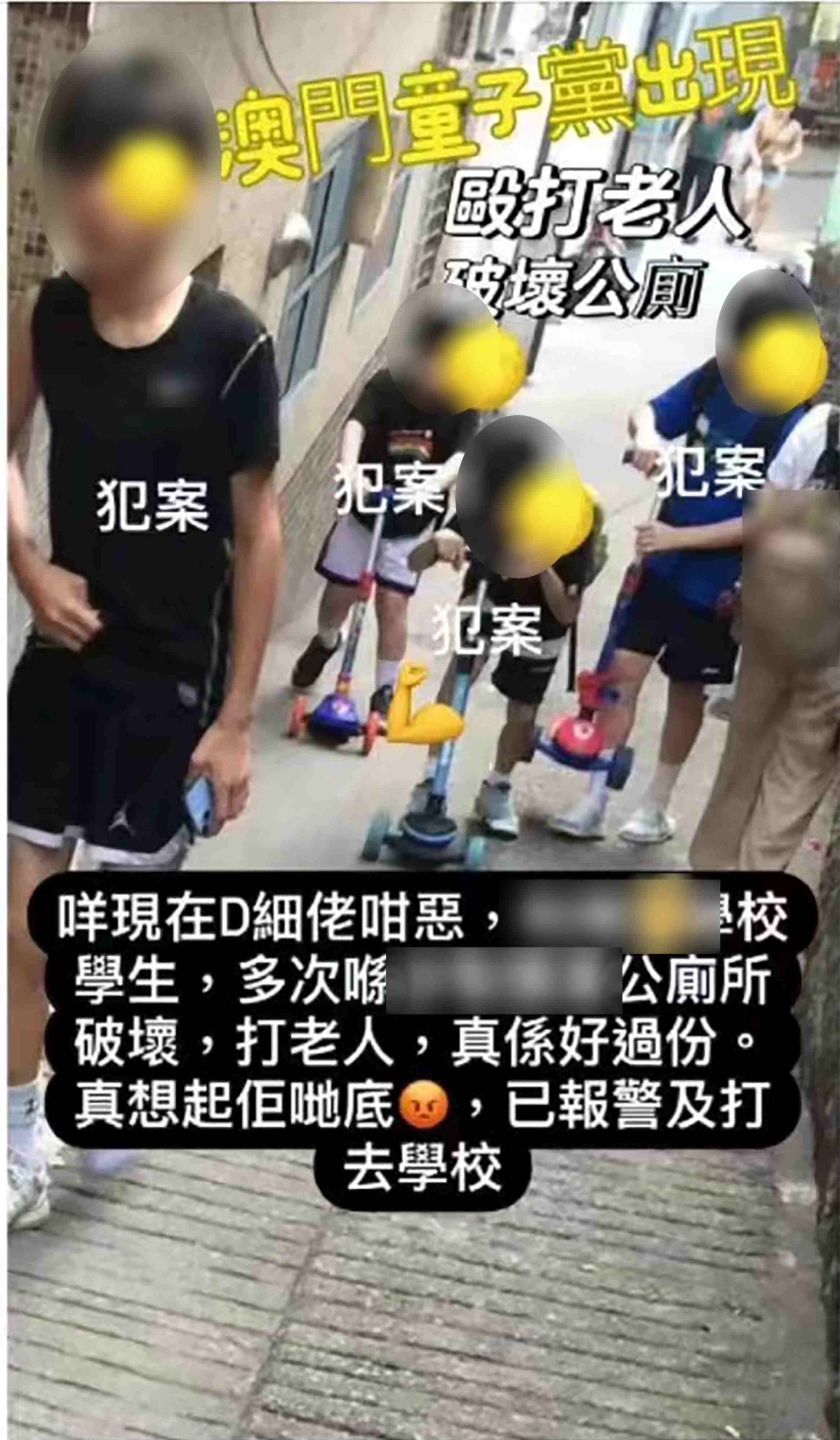 日前有人在網上發出題為「澳門童子黨多次連群結隊毆打老人」的帖文,指有童黨毆打老人及破壞公廁。該帖文指童黨出沒地點在沙梨頭M16公廁大聖廟附近。司警經調查後在17日向傳媒發佈案情,指於本月15日局方在網上發現相關童黨毆打老人帖文後,已隨即立案跟進。