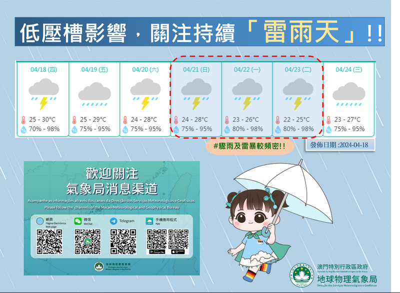 氣象局指出,當局提醒在春季冷暖氣團交接下,有利頻密閃電、強烈陣風、甚至冰雹等強對流天氣出現,呼籲市民出門前留意天氣變化和局方的最新天氣資訊。氣象局又預料本澳周五將繼續受偏南氣流影響,驟雨及雷暴天氣將逐漸增多。此外,一道低壓槽將於本周末開始移近華南沿岸,屆時天氣將變得不穩定,沿岸部份地區日累積雨量將較大,並可能於下周初為本澳帶來更為頻密的驟雨。