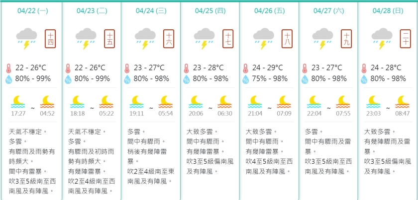 氣象局展望隨著低壓槽稍為減弱,本周中期開始驟雨及雷暴減少,最高和最高氣溫稍微上升一至兩度,本周後期仍然間中驟雨及雷暴,居民未來一周都要帶備雨傘出門了。