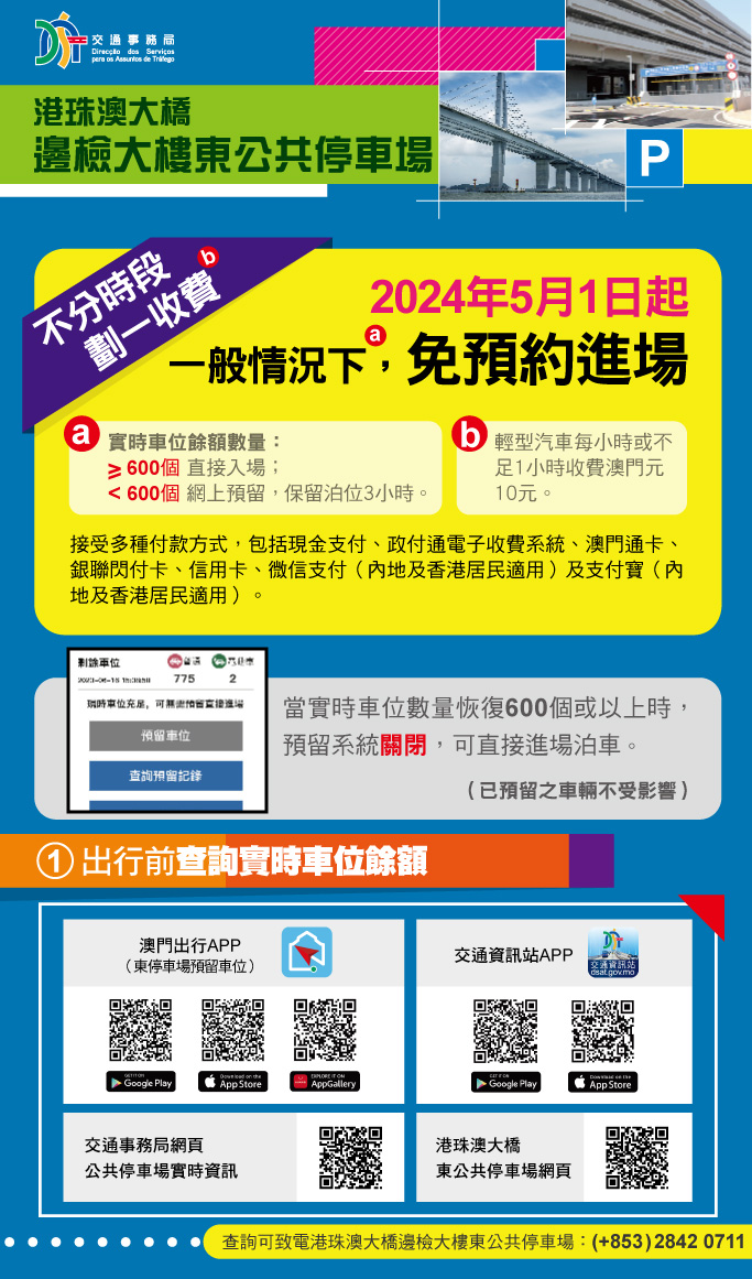 另外,為進一步善用公共資源及促進公共泊車位的合理分配及利用,港珠澳大橋邊檢大樓東公共停車場(東停車場)自5月1日凌晨零時起恢復收費,收費方式及金額調整為所有車輛不分時段按時收費,輕型汽車劃一每小時或不足一小時收費澳門元10元;停車場接受多種付款方式,包括現金支付、政付通電子收費系統、澳門通卡、銀聯閃付卡、信用卡、微信支付(內地及香港居民適用)及支付寶(內地及香港居民適用)。