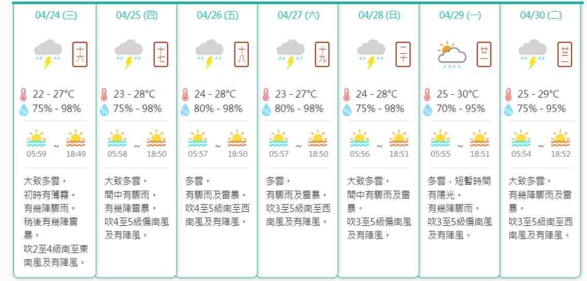 周中起至周末期間大致維持間中有驟雨及有幾陣雷暴天氣,氣溫保持在23度至28度之間,預料到了下周初天氣才會稍為好轉及間中有陽光。
