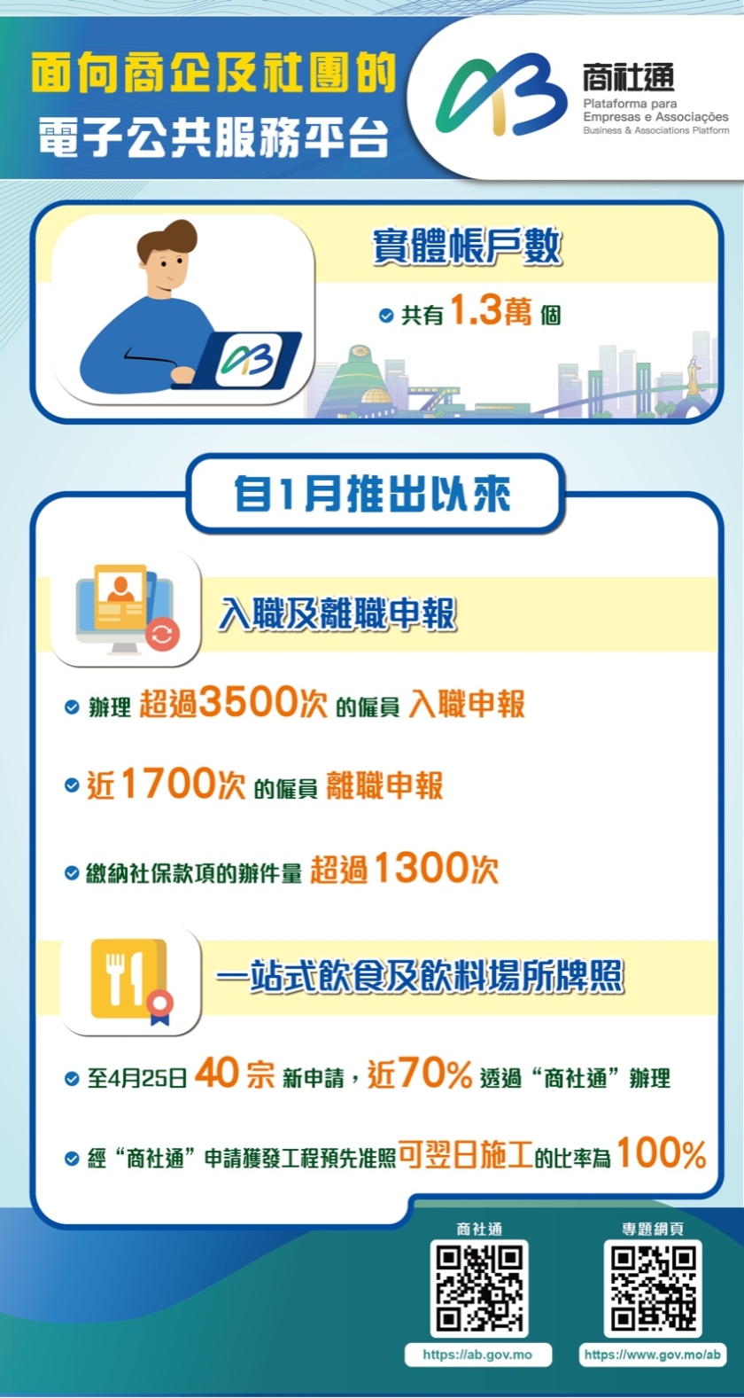 【本報消息】特區政府自今年1月9日推出商社通服務平台,以「匯商聚社、一應通辦」為理念,為企業和社團提供從設立、營運到發展所需的電子化公共服務。商社通上線後受到企業和社團的廣泛關注,現時有近1.3萬個實體帳戶,自推出以來已有超過3,000個實體申請帳戶。