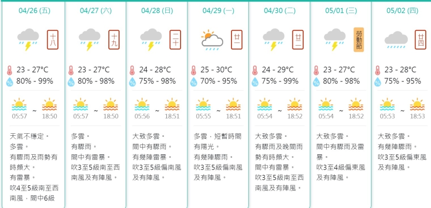 預料周六至下周日本澳仍然多雲有驟雨,間中有雷暴,初期吹三至五級南至西南風及有陣風,後轉吹偏南風,氣溫介乎23度至28度;根據氣象局的七日天氣預報,目前仍然預料下周一有機會短暫時間見到陽光,但仍然以多雲為主,並有幾陣驟雨,最高氣溫會上升至30度。下周一天氣稍微好轉後,下周二勞動節前一日天氣又會再度轉差,預測本澳由下周二起又會再面對有驟雨及間中有雷暴天氣,晚間雨勢有時頗大;下周三勞動節和下周四本澳天氣仍然維持有驟雨或雷暴。