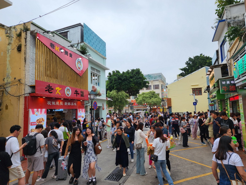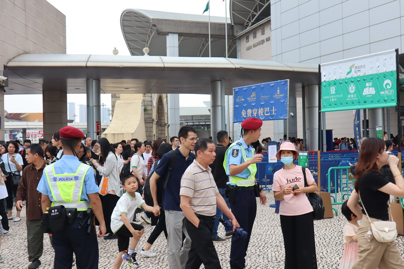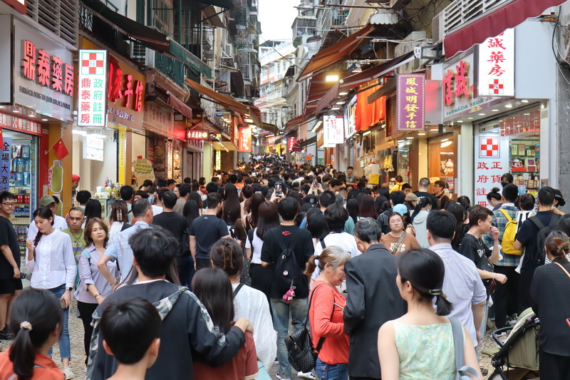 【本報消息】內地為期五天的五一勞動節假期已於周三展開,本澳繼首日錄得入境旅客12.1萬人次後,周四下午五時已錄得超逾首日人數的12.9萬人次,警方連續兩日在大三巴街實施單向人潮管制措施,並一度需要分倉分流潮水式放行;下午又因應氹仔官也街人流持續擠擁,禁止車輛駛入舊城區,是氹仔舊城區在今個五一假期首度實施交通管制措施。