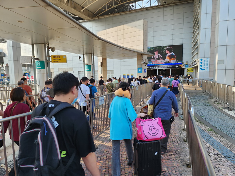 周日進入內地五一假期最後一天,儘管本澳天氣明顯改善,全日維持天陰及短暫時間有陽光的天氣,但似乎對客量沒有太大幫助,根據治安警公佈的初步資料顯示,截至下午五時本澳錄得約5.6萬人次旅客入境,較過去四日同一時段錄得的9.1萬至13.3萬人次明顯減少,同一時段離境旅客同樣錄得約5.6萬人次;入境旅客人數明顯回落後,關閘巴士站和酒店穿梭巴士站已不見排長龍情況,新馬路、大三巴和氹仔官也街一帶旅客人流與平時周末假期差不多,因此,警方連續四日在大三巴街實施單向人潮管控措施後,周日無需再實施,但現場仍見有多名警員在場戒備。
