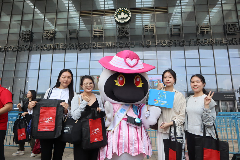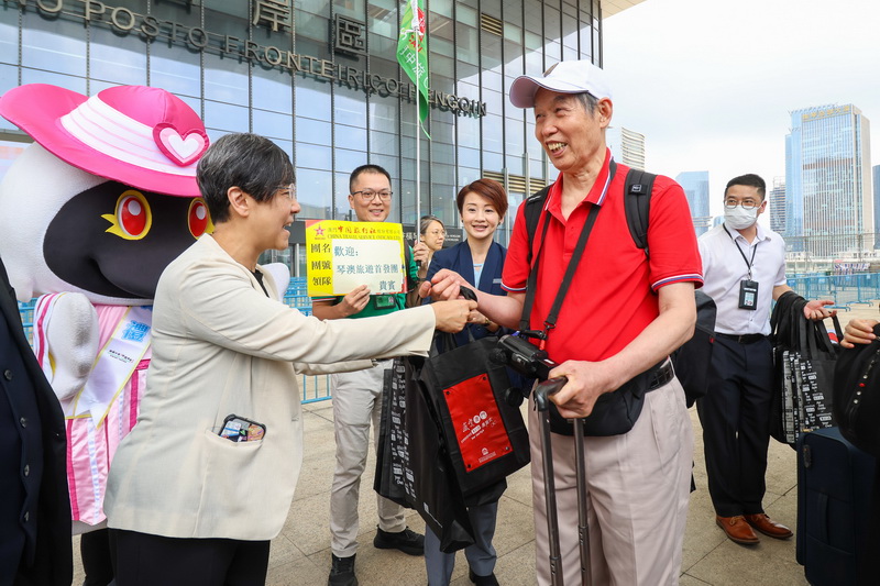 國家移民管理局四月底公佈進一步便民利企出入境管理六項政策措施由周一起實施,當中包括允許參加琴澳旅遊團的內地居民以「團進團出」方式多次往返澳琴,首個利用該政策來澳的琴澳旅遊團早上經橫琴口岸抵澳,文綺華與澳門旅遊吉祥物「麥麥」一同到場歡迎該一行16人的首發團,並向團員逐一致送澳門旅遊紀念品。
