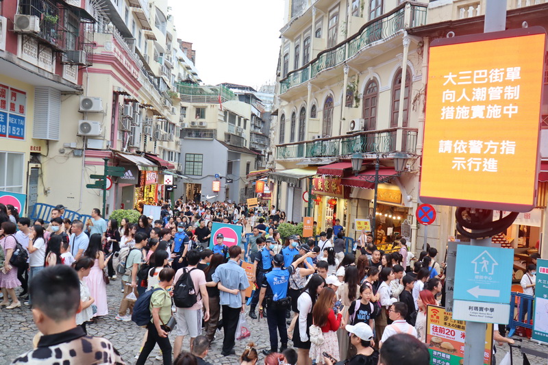治安警表示五一期間已持續關注各旅遊熱點的人流情況,特別是新馬路、大三巴和氹仔官也街一帶人流暢旺。為有效疏導人流及車流,警方增派警員到各旅遊熱點維持秩序,五一假期期間警方於大三巴街共實施四次人潮管制措施,於氹仔官也街共實施兩次交通管制措施,並指市民和旅客均積極配合現場警員的指示行進,整體市面秩序保持良好。