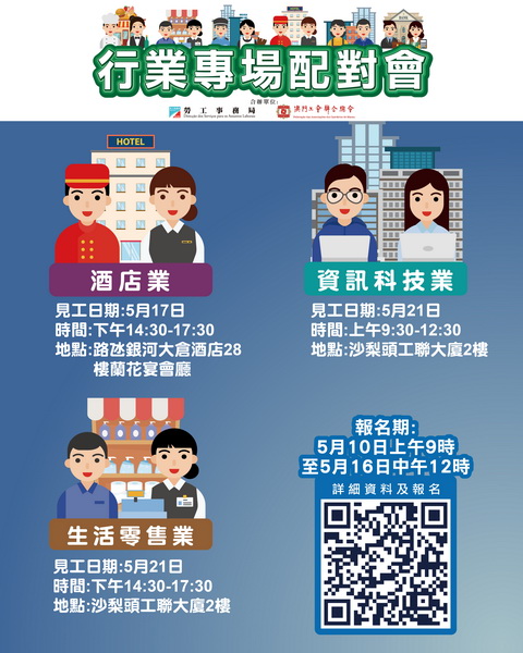 5月17日下午酒店業配對會在澳門大倉酒店28樓蘭花廳舉行;21日上午資訊科技業配對會及下午生活零售業配對會在沙梨頭海邊街2-6號工聯大廈二樓工聯舉行。