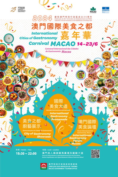 旅遊局主辦的「澳門國際美食之都嘉年華」於6月14至23日期間每天下午三時半至晚上10時,在澳門漁人碼頭羅馬廣場及勵駿大道舉行,三大亮點活動包括「國際美食大道」、「美食之都廚藝展示」及「澳門國際美食論壇」。