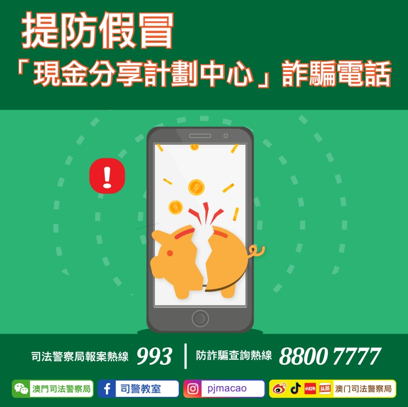 【本報消息】司警局於周一接獲多名市民舉報,指分別收到假冒「現金分享計劃中心」人員來電,對方以粵語及普通話錄音訛稱事主領取「現金分享」的資格已被取消,如欲了解更多詳情,需按錄音指示作進一步操作。