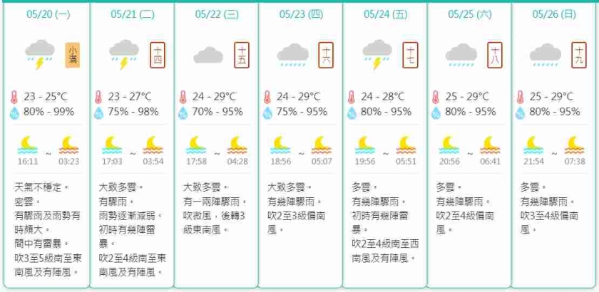 氣象局預測周一密雲及有驟雨,雨勢有時頗大,間中有雷暴。吹四至五級南至東南風及有陣風,氣溫約為攝氏23至25度,相對濕度介乎百分之80至99之間。周二大致多雲及間中有驟雨,初時有幾陣雷暴,吹二至四級南至東南風及有陣風,氣溫介乎23至27度,相對濕度介乎百分之75至98之間。