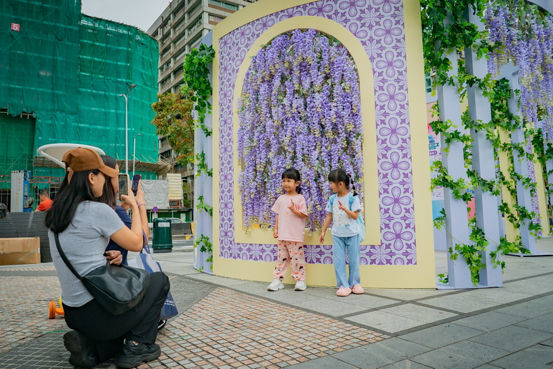 繼四月底推出「綠野迷蹤」及「願望花廊」兩組大型打卡裝置後,本月22日主辦單位再度推出兩組新裝置,分別是設於黑沙環公園圓形地的「奇夢拱築」裝置,以太陽花為主題打造出充滿活力的巨型花拱門;以及設於筷子基北灣休憩區的「細說花語」裝置,以紗簾般垂下的紫藤花打造成區內休憩和打卡好去處,讓市民和旅客從生活中放慢腳步,感受悠然愜意的一刻。